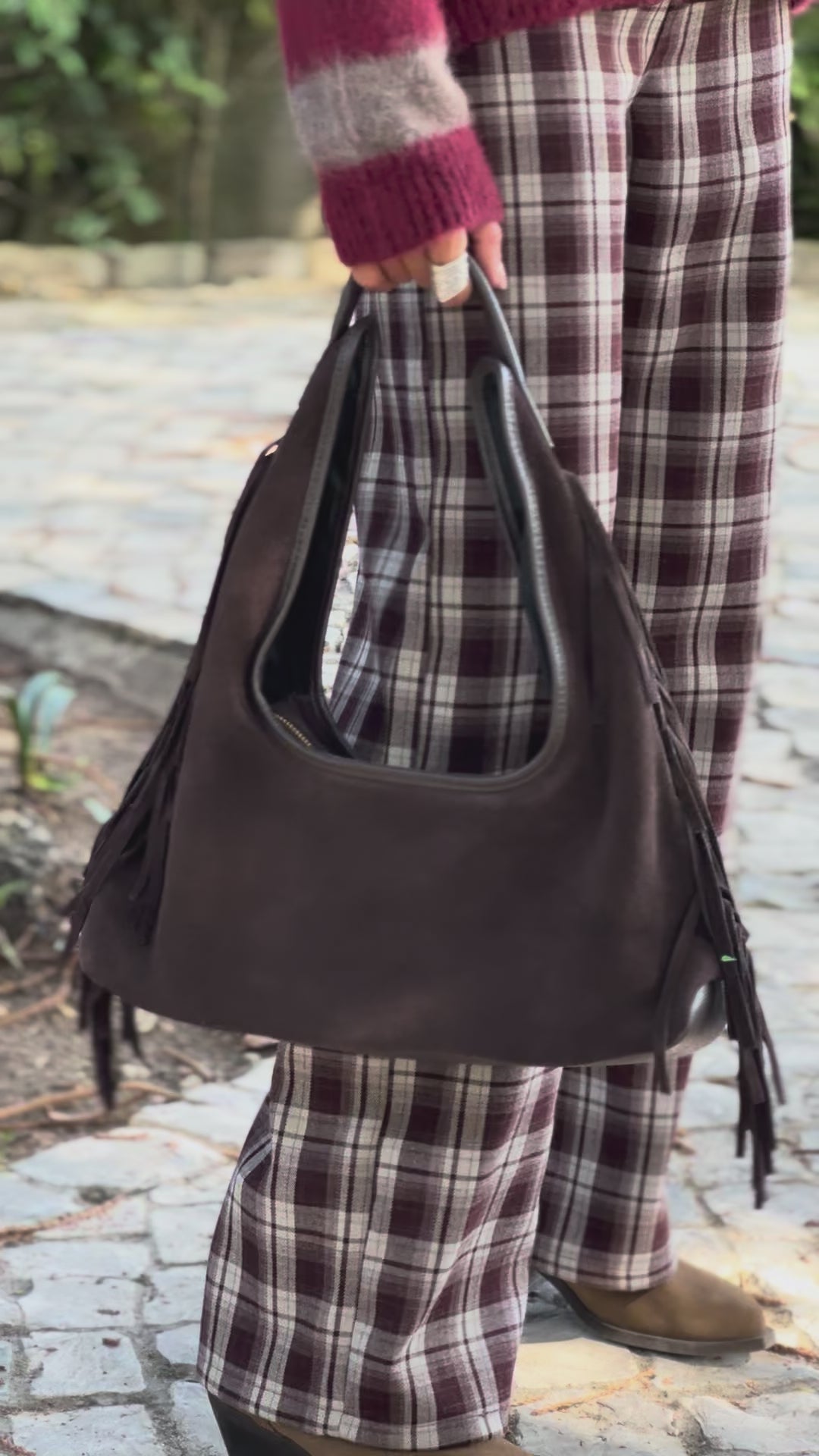 - Brown suede leather bag with bangs
