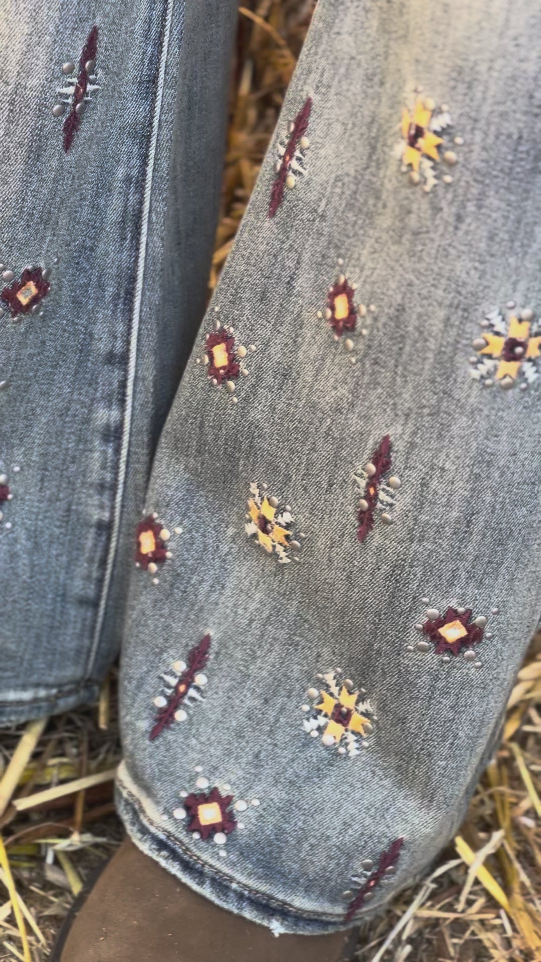 - Embroidered jeans with stud details