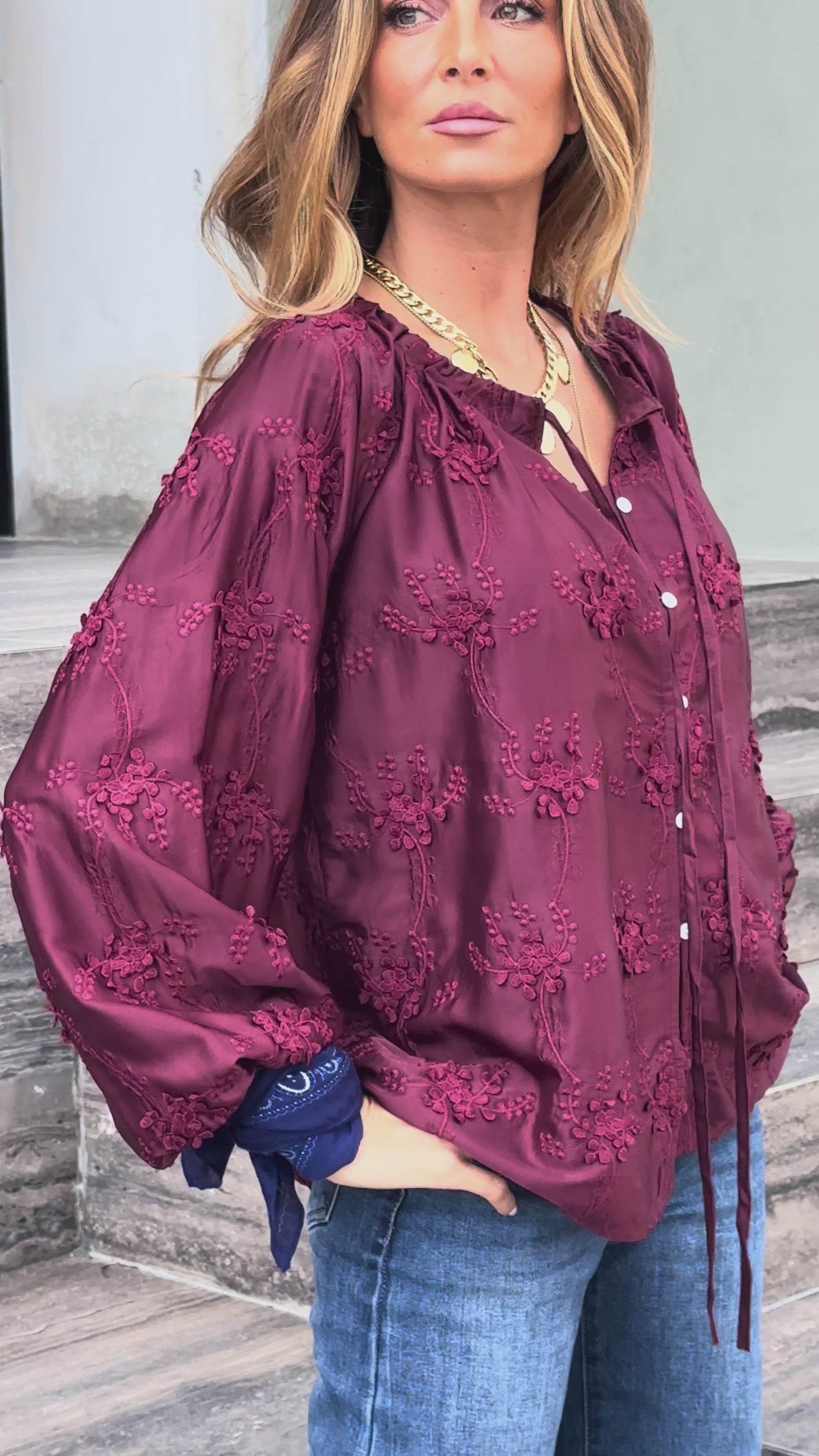 - Bordeaux satin effect blouse with embroidered details