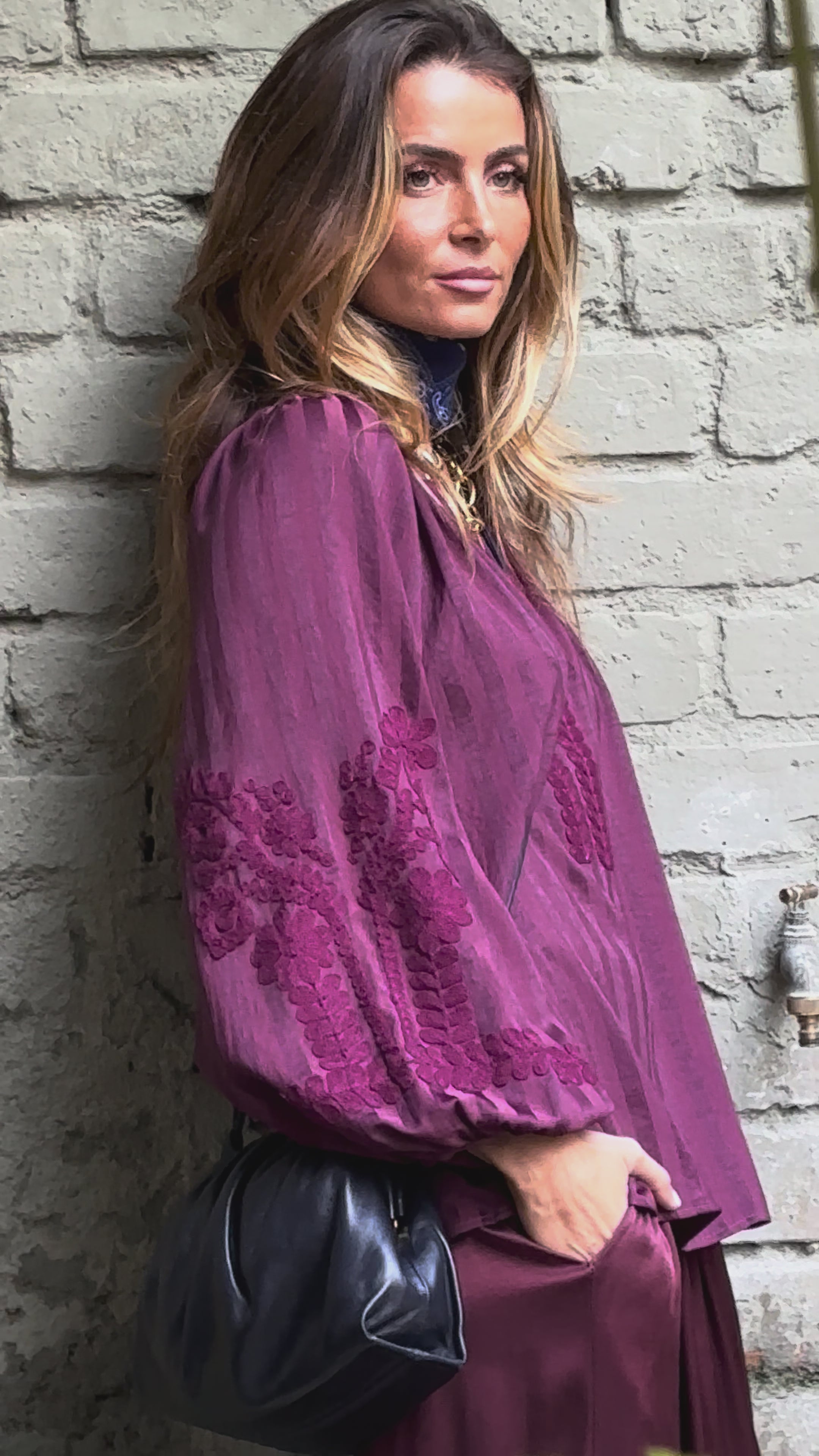 • Túnica bordeaux com estampado riscas e detalhes bordados