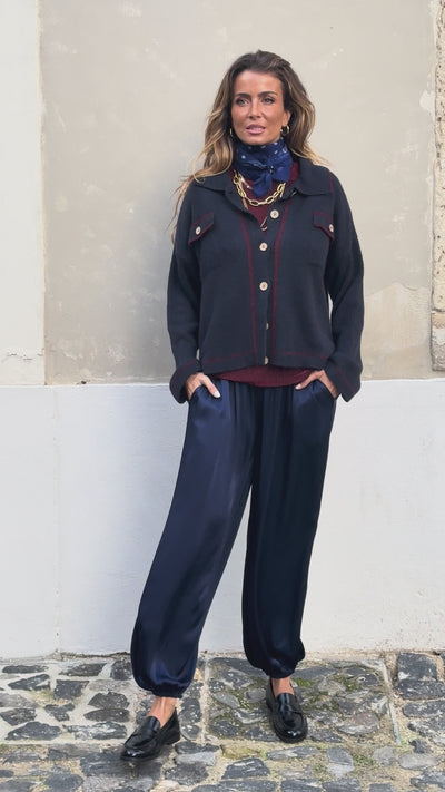 • Casaco de malha azul com risca bordeaux na gola, bolsos e carcela