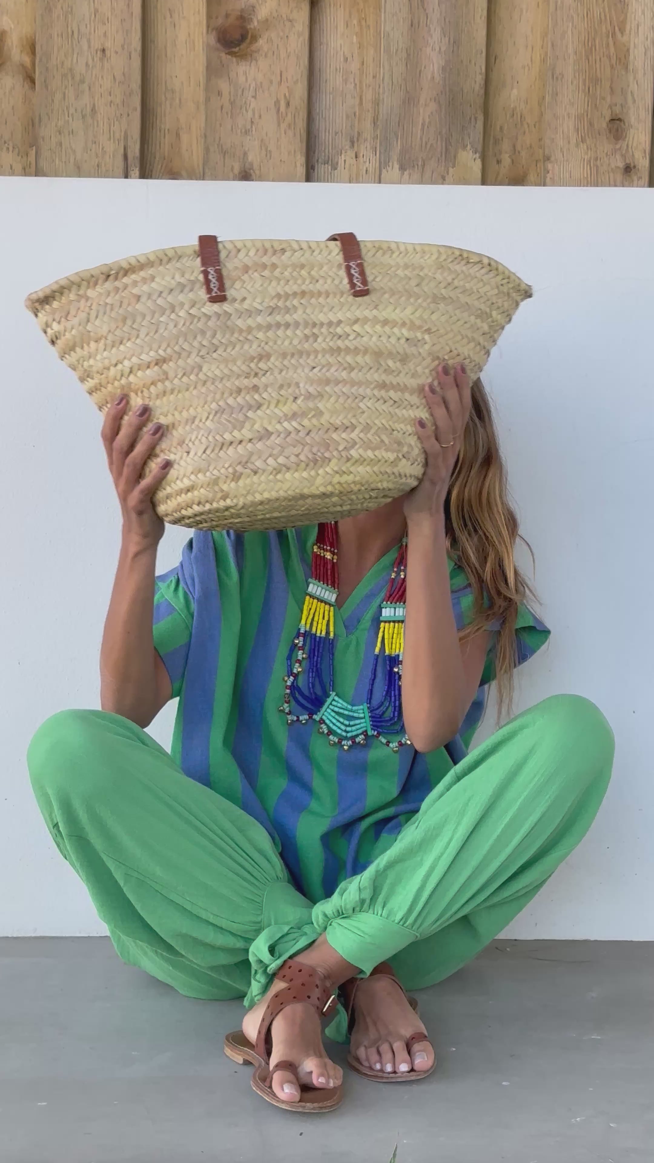 • Cesta de ráfia com alças em pele